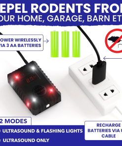 USE ANYWHERE, NOT JUST YOUR CAR: Since the repeller can also be powered wirelessly via 3 AA rechargeable batteries (included) you can place it anywhere you want to deter rodents, e.g as a squirrel repellent for attic. When the batteries die you can recharge them with the included USB cable, or simply leave it plugged in to run it 24/7 without it ever dying. You also have the option of turning off the strobe lights, so you can use it at home in rooms where the lights would be annoying to see.